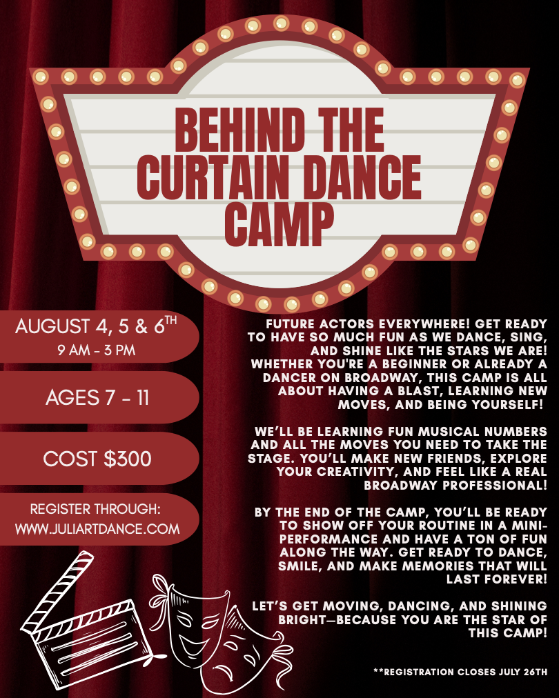 In this Broadway-inspired camp, dancers will sing, dance, and learn fun musical theatre choreography while exploring creativity and stage confidence. Along the way, they’ll make new friends, learn exciting routines, and feel like real Broadway stars. Camp concludes with a mini performance for family and friends!